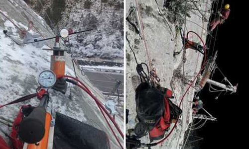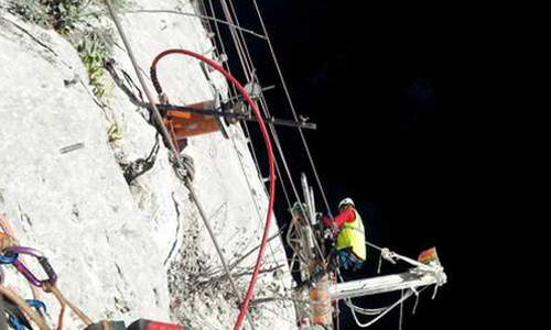 Test d’ancrage en milieu montagneux avec un vérin creux de 60T alimenté par une centrale sur batterie 700 bar.