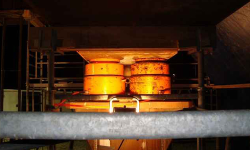 Vérin double effet 1000T course 200mm avec tête oscillante utilisé pour tester la résistance d’une galerie sous-terraine. Alimentation par une centrale hydraulique assurant des cycles de pression automatiques.