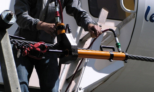 Décâblage d’un balancier 12S avec un vérin de traction 10 tonnes en alliage léger course 600mm, sécurisation par clapet freineur, alimenté par une centrale sur batterie 700 bars à distribution électrique.