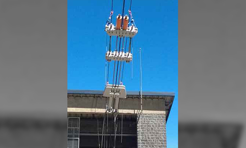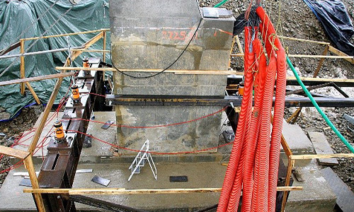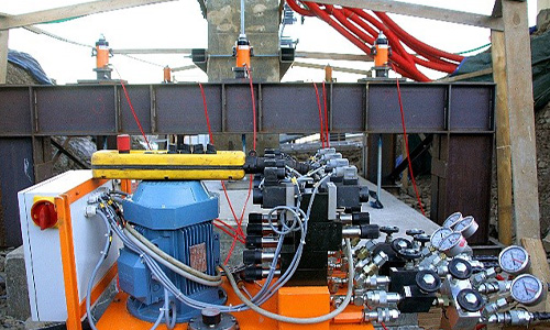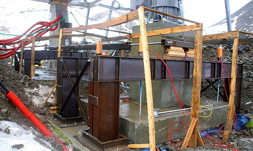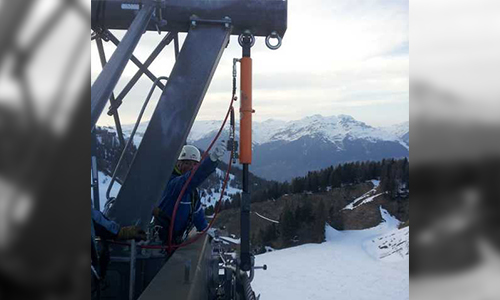 Relevage des fondations d’une gare de télésiège pour remise de niveau et réalignement des massifs. Opération réalisée avec l’aide de vérins creux et de centrales à débits séparées égaux afin de pouvoir ajuster chacun des points de levage.